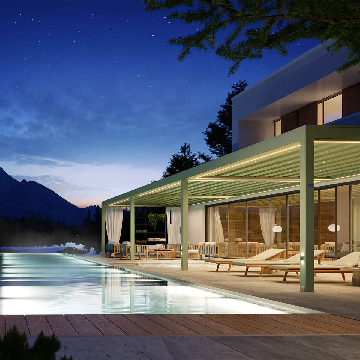 Skyluxia rappresenta un nuovo livello di benessere all’aperto: una pergola innovativa dotata di lamelle sia fisse che mobili, capaci di sollevarsi e sovrapporsi seguendo l’andamento naturale della luce solare. Si tratta di una bioclimatica di grande eleganza che consente l’installazione di mensole e elementi sospesi direttamente sulla copertura, offrendo così una soluzione d’arredo completa. È compatibile con chiusure vetrate perimetrali, tende verticali Raso, sistemi di illuminazione LED e pavimentazioni modulari.