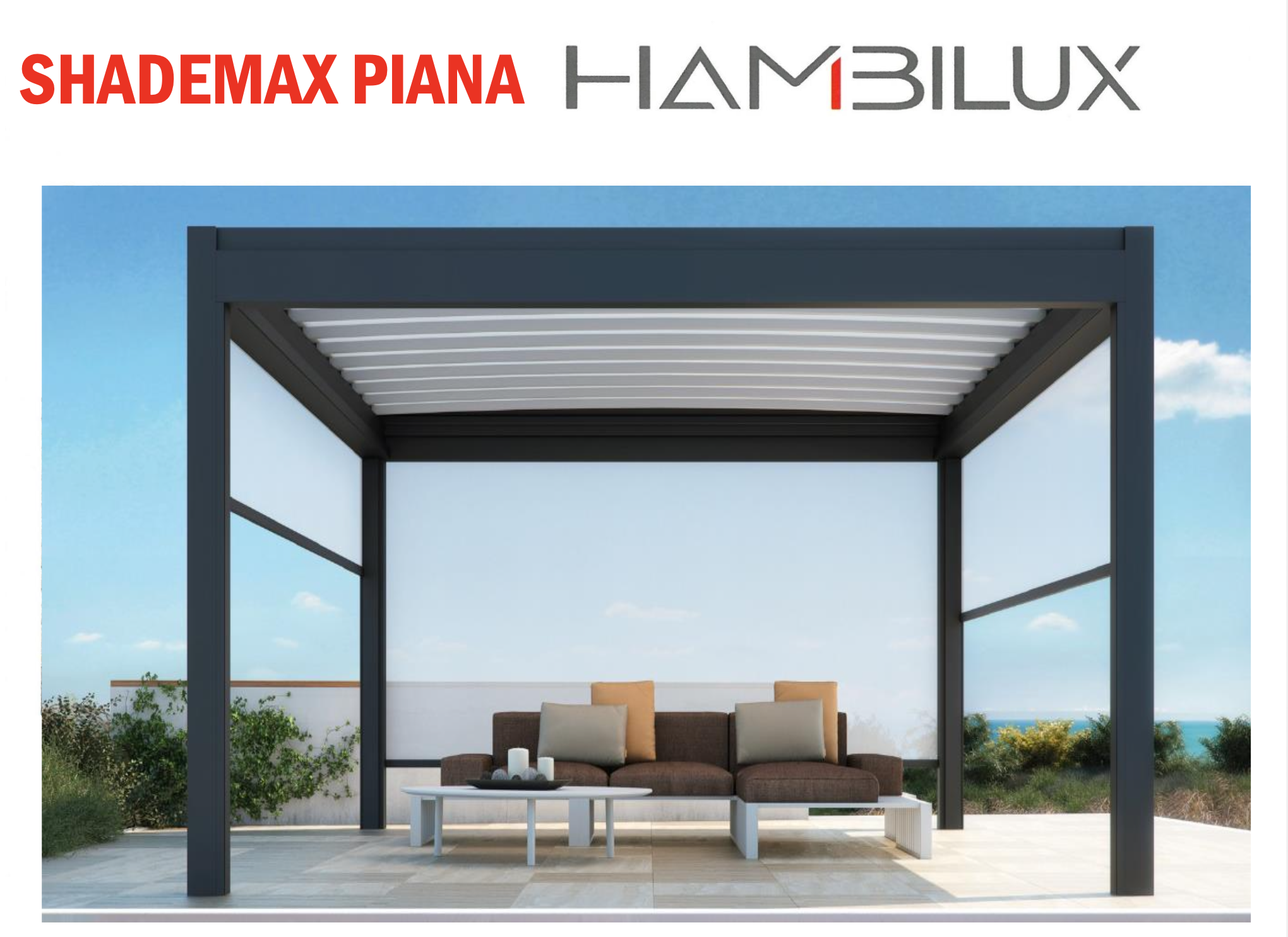 SHADEMAX è la pergola addossata motorizzata di Hambilux: copertura retrattile in tessuto tecnico, ombra su misura e protezione da sole e pioggia per terrazzi, balconi e dehors.